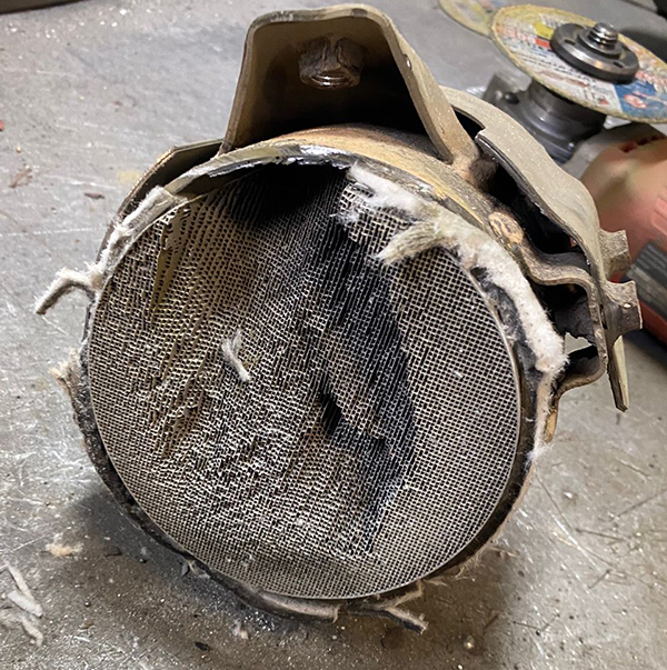Стандартная ситуация выглядит примерно следующим образом. Допустим, ошибка впервые загорелась вчера, а сегодня катализатор разрезали. Обычная картина, как на фото ниже. Передний модуль существенно пострадал.