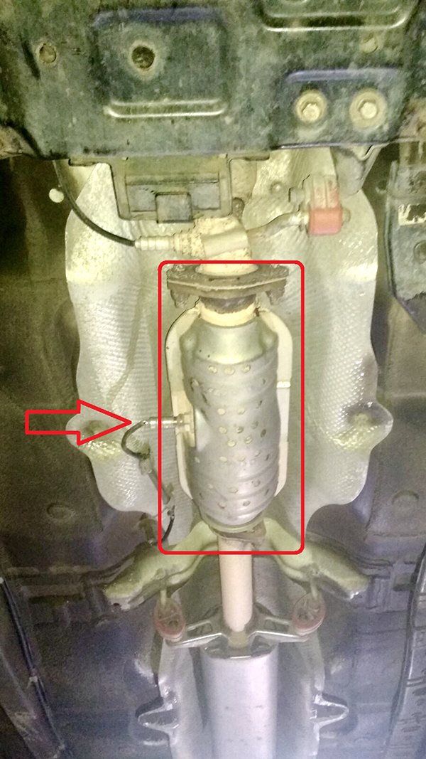 У машины 2008 - 2010 года выпуска (150 / 164 л.с.) катализатор один и под днищем (обведен красным). Стрелкой указан задний лямбда-зонд, отвечающий за контроль эффективности работы каталитического нейтрализатора.