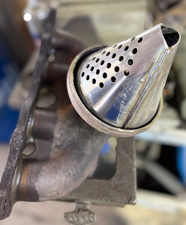 - КОНУСНАЯ ВОРОНКА которая ставится в выпускной коллектор и создает в отличие от пламегасителя подпор выхлопным газам, что не допускает масложора. Не рекомендуем ставить пламегаситель, если не хотите получить масложор! Подробнее тема жора масла после удаления катализатора разобрана на этой странице нашего сайта.