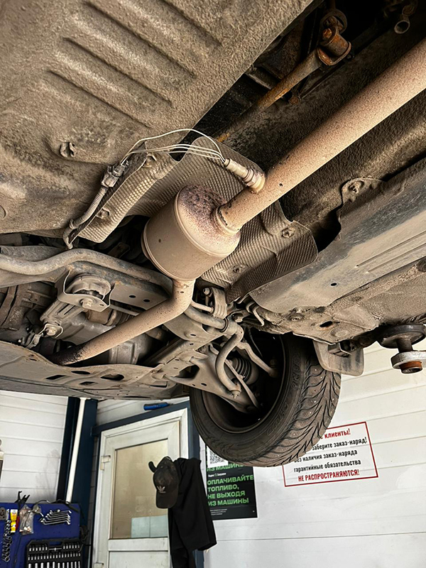 Вот так выглядит катализатор, который можно увидеть только снизу. Обратите внимание на торчащий провод. Это задний лямбда-зонд. Видно, как хорошо потрепана оплетка проводка. А датчик этот не из дешевых. После перехода на пламегаситель мы его отключаем, что дает автомобилю дополнительные преимущества в плане надежности (ликвидировано еще одно слабое место).