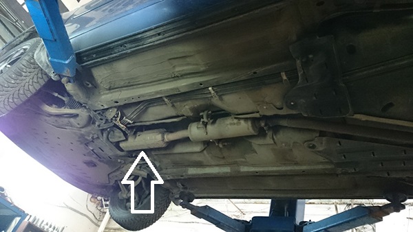 Катализатор под днищем (указан стрелкой)
