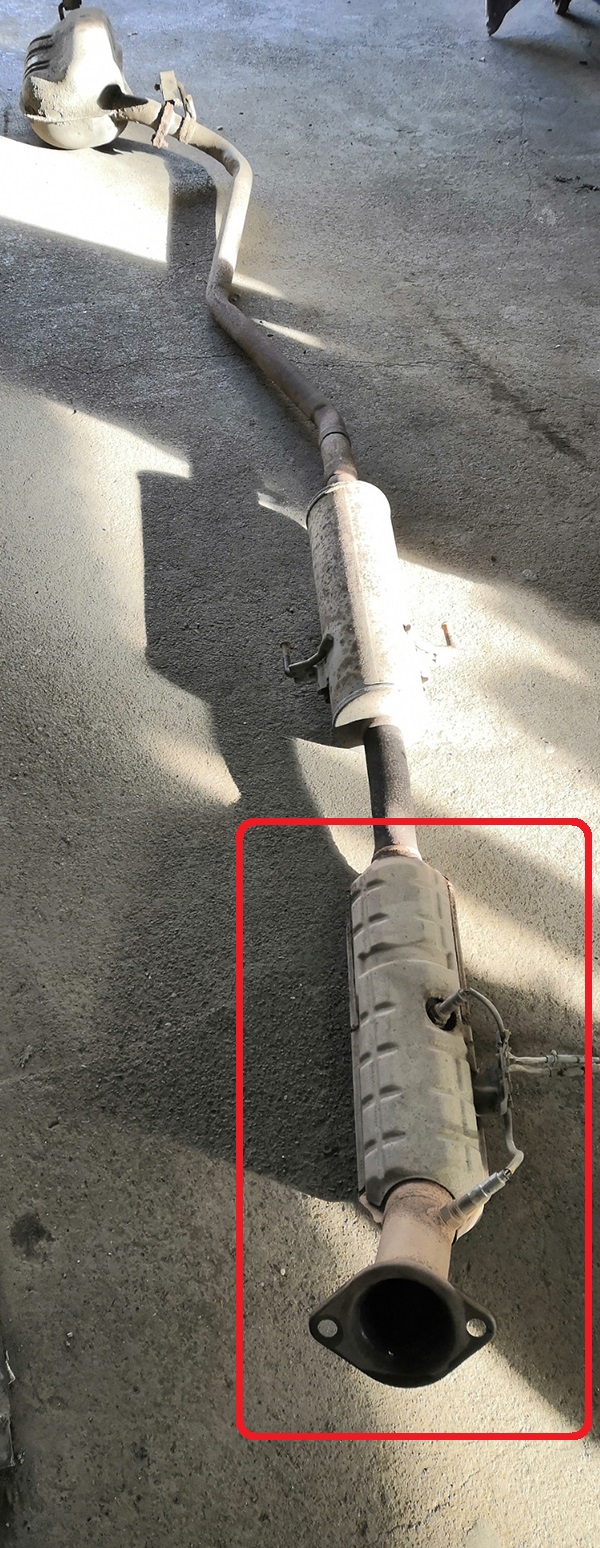 Снятый выхлоп — катализатор обозначен красным прямоугольником