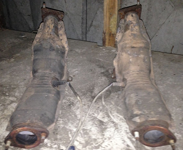 Снятые катализаторы Инфинити ФХ35. Как в кузове S50, так и в случае S51 каждый катализатор состоит из круглого керамического и плоского металлического элемента.